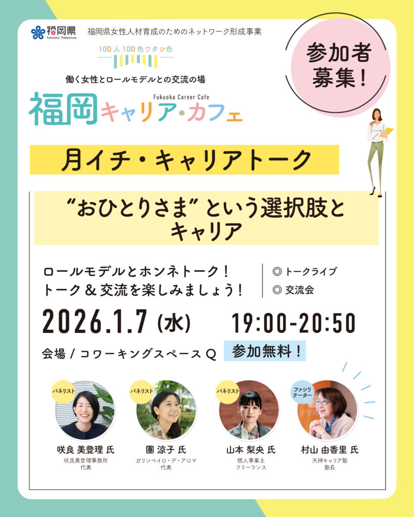 対 象: 福岡キャリア・カフェ会員 (福岡県内の働く女性。会員登録無料) →登録はこちら